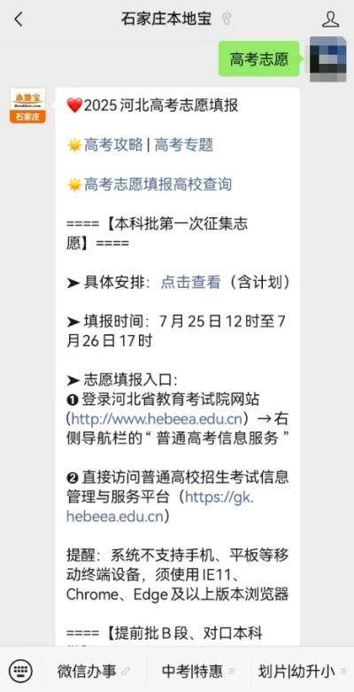 温馨提示:微信搜索公众号【石家庄本地宝】,关注后在对话框回复【高考志愿】,可获取更多关于2025河北高考征集志愿填报入口/时间/计划、操作流程(含视频)、官方指导短片、注意事项等。