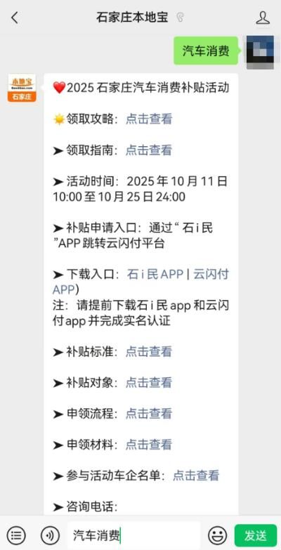 温馨提示:搜索微信公众号【石家庄本地宝】,关注后在对话框回复【汽车消费】查看石家庄2025汽车消费补贴申领入口、补贴金额、申领时间/流程/材料、参与活动车企、咨询电话等消息。